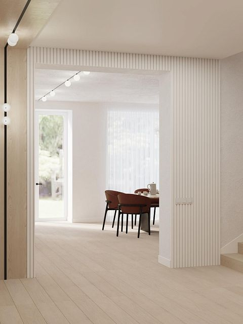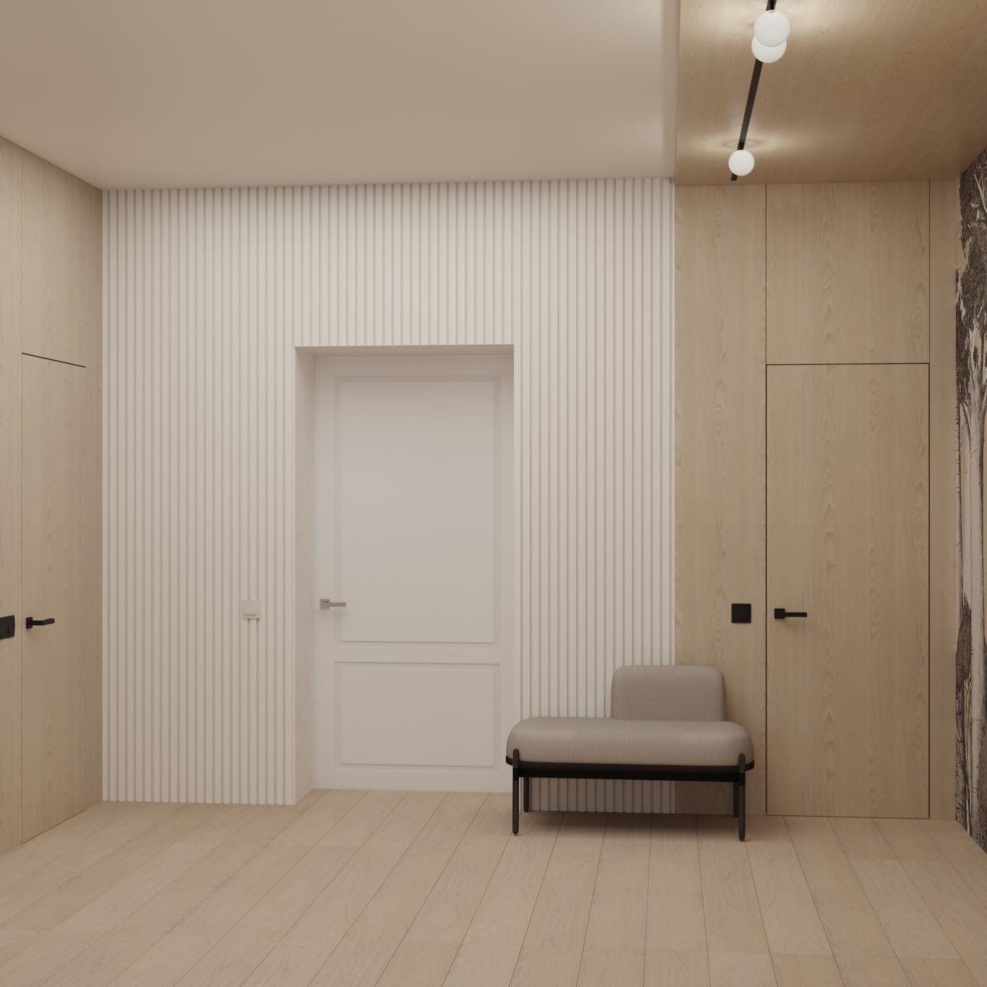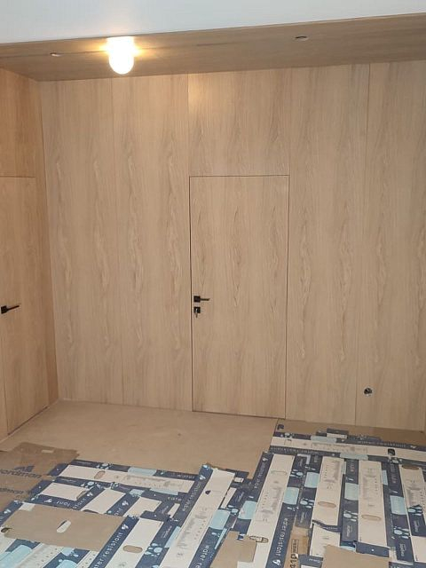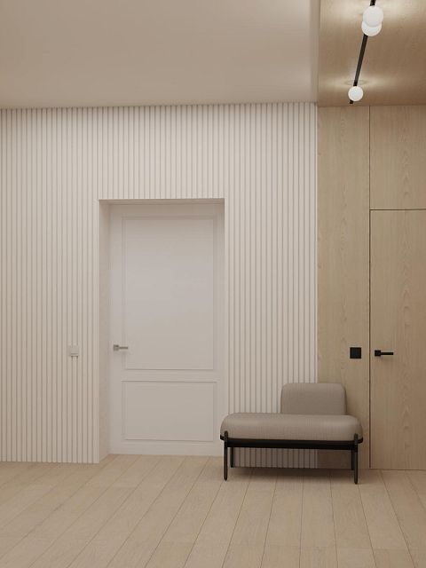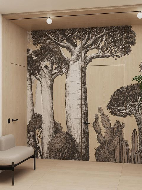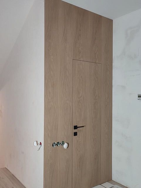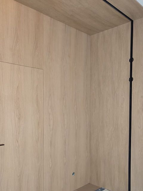 В проекте использовали: двери с компланарным погонажом и стеновые панели в натуральном шпоне "Песочный дуб". Такое стилистическое решение сейчас считается трендом и даёт волю для фантазии! P.S. Планируется ручная роспись дизайнером-декоратором, вызывает полный восторг!