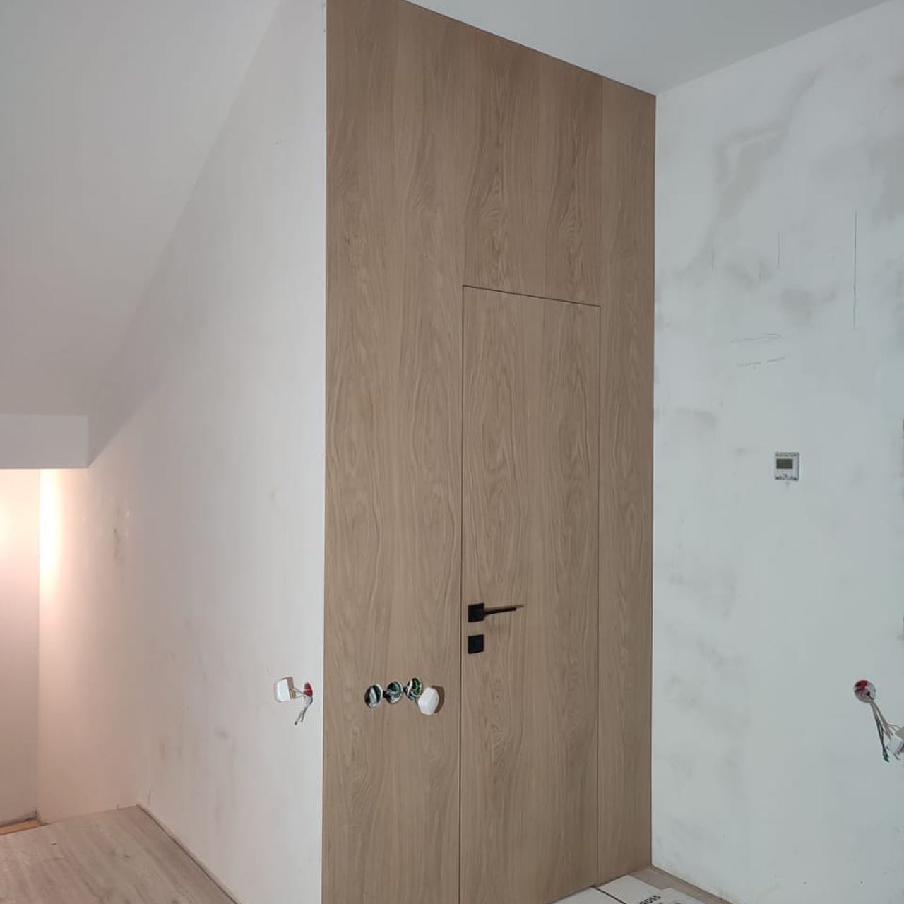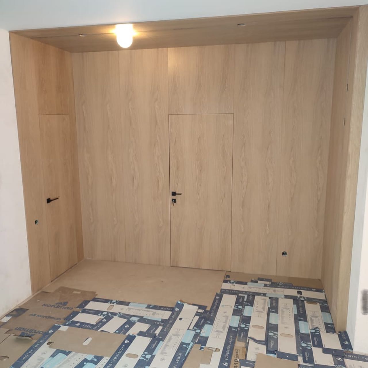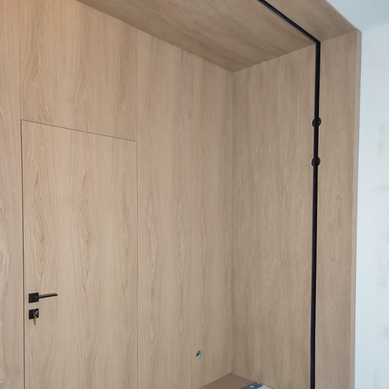 В проекте использовали: двери с компланарным погонажом и стеновые панели в натуральном шпоне "Песочный дуб". Такое стилистическое решение сейчас считается трендом и даёт волю для фантазии! P.S. Планируется ручная роспись дизайнером-декоратором, вызывает полный восторг!