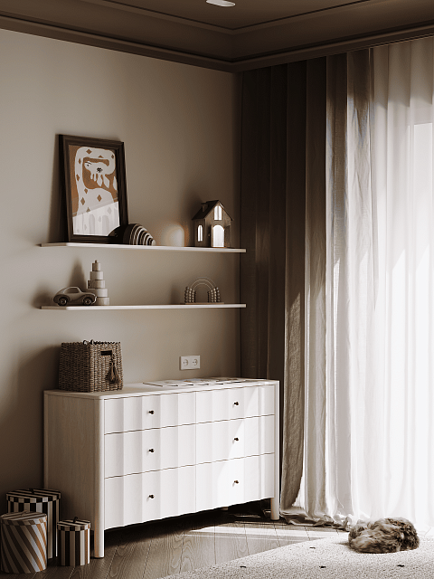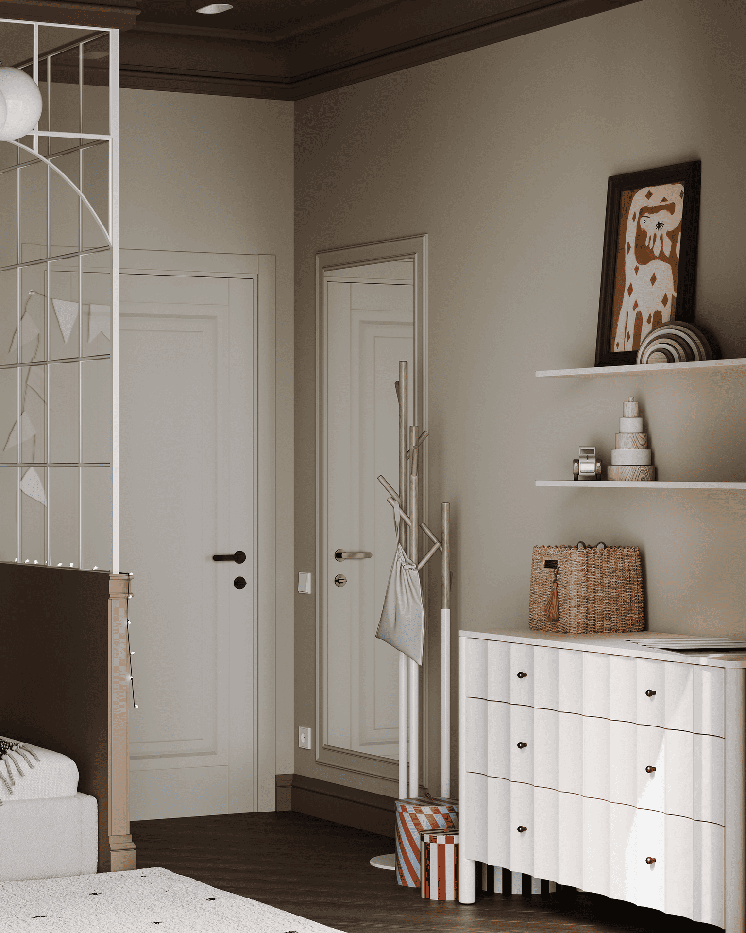 Весь интерьер выполнен в нейтральных оттенках, а акцентами тут служит декор. Дверь от Terem "Bergamo 1" сливается с общим фоном, тем самым не перегружая его.