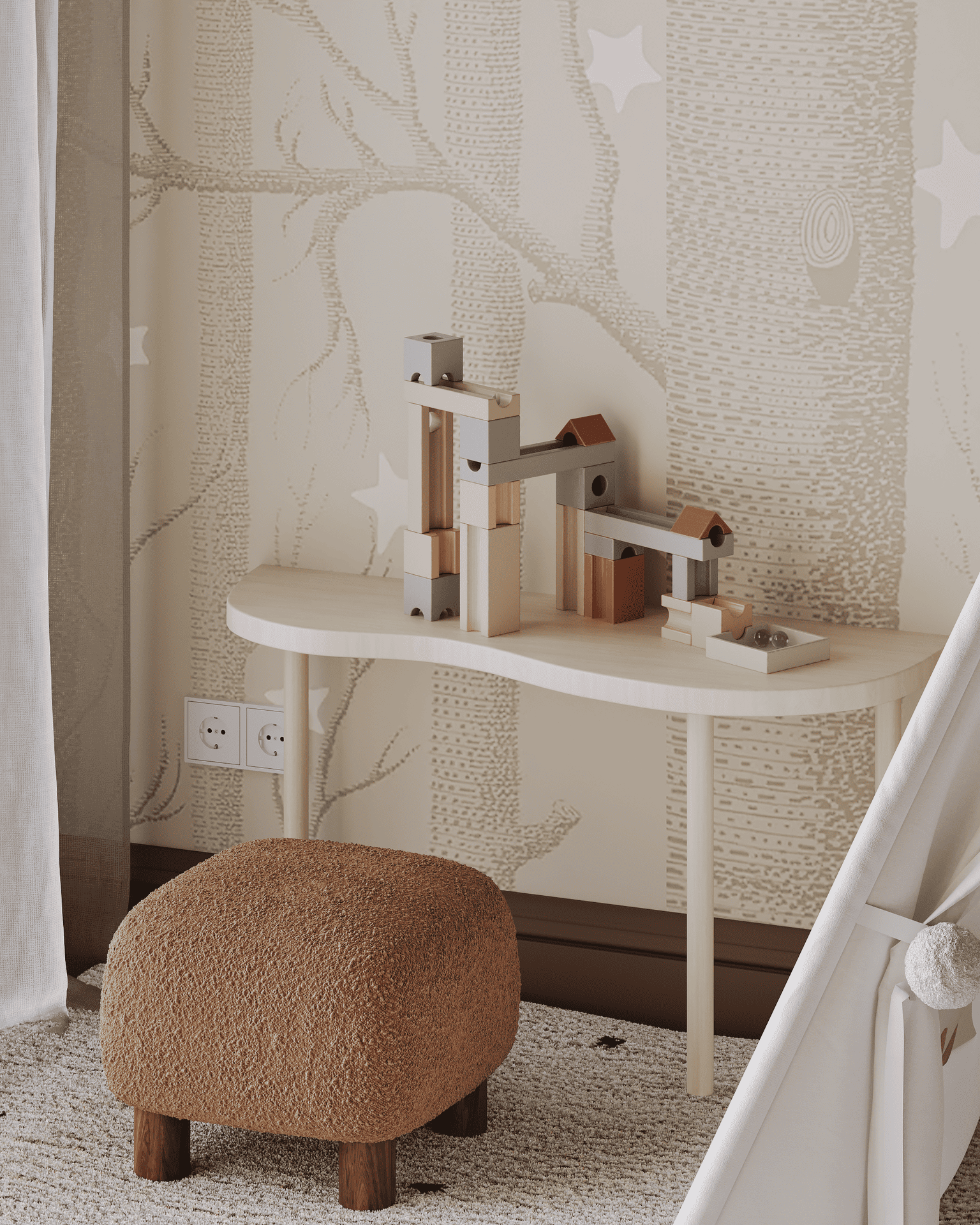 В этой детской ребёнок может чувствовать себя защищено: кровать находится как бы "в домике" - там удобно отдыхать и читать книжки. Вне "домика" - таинственный лес, который воссоздаётся, благодаря обоям от Cole & Son 'Woods stars'. Здесь стоит палатка, в которой можно валяться на подушках и играть.