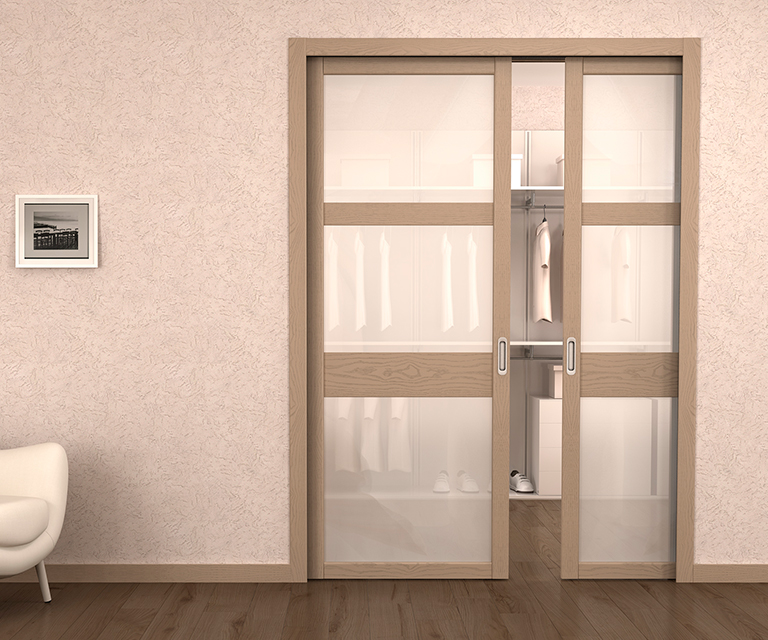 Для раздвижных дверей можно использовать стекло различных видов. Один из популярных и недорогих вариантов — матовое стекло. В обрамлении рамки с выразительной структурой под дерево оно смотрится гармонично и умиротворяюще. Для роскошных классических и ярких интерьеров можно использовать цветные витражи, современные узоры или надписи.